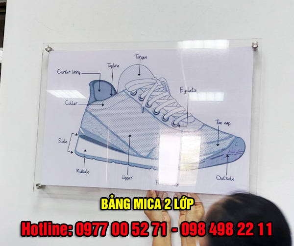 Bảng mica 2 lớp được tạo thành bởi 2 lớp mica trong hoặc 1 trong 1 màu, ghép vào nhau, ở giữa 2 lớp mica đó là nội dung hoặc hình ảnh mà doanh nghiệp của bạn muốn gửi gắm, thường thì mica 2 lớp được gắn bởi ốc chân kính, để quý khách dễ dàng tháo ra để thay nội dung hoặc hình ảnh.