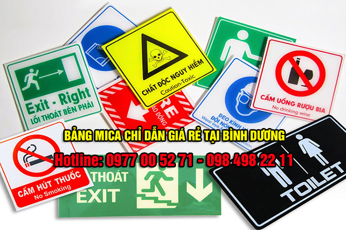 Bảng biển chỉ dẫn mica từ lâu rất được ưa chuộng trong ứng dụng làm bảng chỉ dẫn, biển báo chỉ dẫn hay sơ đồ chỉ dẫn cho các cơ quan, ngân hàng, nhà sách, siêu thị, bệnh viện và các nơi công cộng như bến xe, ga tàu, sân bay... Bảng biển chỉ dẫn mica có ưu điểm là độ bền cao, xuyên sáng tốt, gắn lên được trên mọi bề mặt, giá thành làm bảng biển chỉ dẫn mica tại Bình Dương khá rẻ. Bảng biển mica sau khi được cắt ra theo kích thước yêu cầu, sẽ được dán decal nội dung lên trên tấm mica. Nếu cao cấp hơn, bảng mica có thể in uv trên nhựa mica với mọi hình ảnh, chữ, logo đều được. Bảng biển mica in uv sẽ có giá cao hơn là bảng biển chỉ dẫn mica dán decal, tuy nhiên độ bền cao hơn.