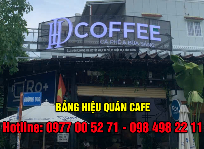 Để kinh doanh quán cafe mang lại nhiều hiệu quả thì việc đầu tiên cần làm đó là đầu tư vào phong cách của quán cà phê mà bạn sẽ kinh doanh, một phong cách cổ điển hay hiện đại cần phải xác định rõ ngay từ ban đầu. Trong đó phần quảng cáo thương hiệu sẽ quyết định thành công. Để thu hút được ánh nhìn của khách hàng thì bạn cần phải có một bảng hiệu quán cafe đẹp và bắt mắt, kết hợp với kĩ thuật và thẩm mĩ cho khâu bố trí, thiết kế một không gian mang vẻ đẹp độc đáo và thật tinh tế. Công ty DV Quảng Cáo Bình Dương sẽ giúp bạn thiết kế, thi công một bảng hiệu đẹp mắt nhất.